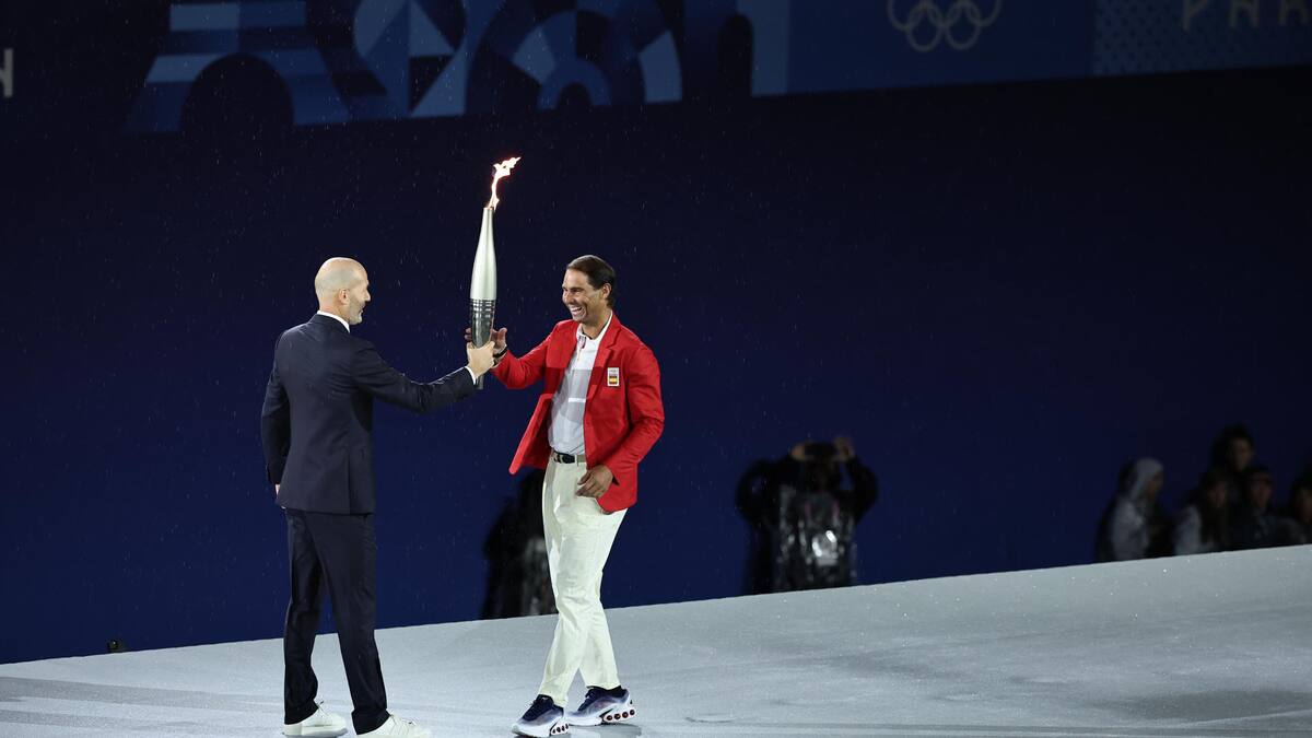 Entre gritos de ‘Zizou’, ‘Zizou’, la leyenda del fútbol francés apareció en el estadio del Trocadero, sede del final de fiesta, y entregó el fuego sagrado del olimpismo a Nadal, que avanzó hacia el río Sena y tomó allí una barca. En ella le esperaban la tenista estadounidense Serena Williams, la gimnasta rumana Nadia Comaneci y el atleta norteamericano Carl Lewis.