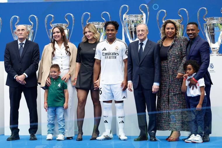 Endrick culminó sus palabras animando a los presentes a decir 'Un, dos, tres; Hala Madrid' y posteriormente procedió a besar el escudo de la camiseta en varias ocasiones y a repartir balones entre las decenas de miles de aficionados, algunos de ellos con camisetas del Real Madrid o de la selección brasileña, que se dieron cita en las gradas para un acto previsto a las 12:00 horas (-2 GMT).