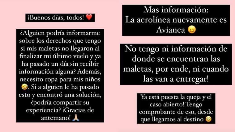 “No tengo ni información de dónde se encuentran las maletas, por ende, ni cuándo las van a entregar. Ya está puesta la queja y el caso abierto. Tengo comprobante de eso desde que llegamos al destino”, publicó.