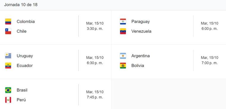 Bolivia, Chile y Perú con 9, 5 y 3 puntos, quedaron eliminados. Este jueves 10 de octubre 2024, jugará Colombia contra Bolivia a las 3 de la tarde.