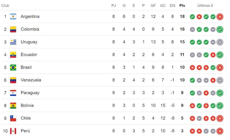 Después viene Ecuador que le ganó a Perú, y quedó con con 11 puntos y +2. Brasil por su parte, cayó ante Paraguay y se ubicó en el quinto lugar con 10 puntos y +1 en la diferencia de gol.
