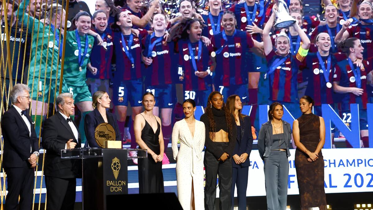 El premio femenino recayó en el Barcelona, campeón de la Liga de Campeones y de la liga española y su presidente, Joan Laporta, así como su capitana, Alexia Putellas, subieron a recibirlo.