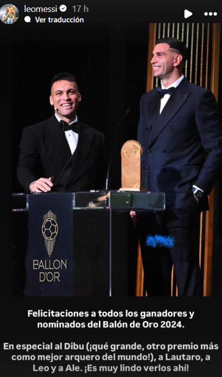 ““Felicitaciones a todos los ganadores y nominados del Balón de Oro 2024. En especial al Dibu (¡qué grande, otro premio más como mejor arquero del mundo), a Lautaro, a Leo y a Ale. ¡Es muy lindo verlos ahí!”, escribió Messi en una historia de instragram, con una fotografía del ‘Dibu’ y Lautaro.