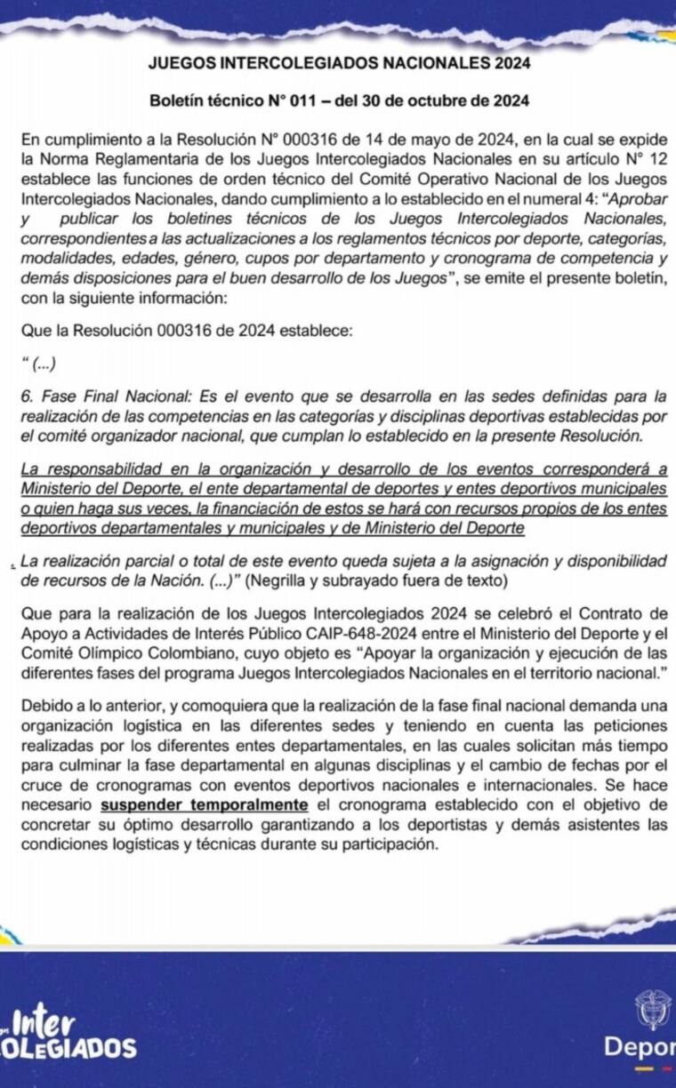 Sin embargo, ni lo uno ni lo otro. En las últimas horas se conoció un boletín técnico publicado en el Ministerio del Deporte y firmado por Andrea Patricia Avila, coordinadora general de los Juegos Intercolegiados Nacionales, en el que se lee que la fase final del evento, prevista para llevarse a cabo entre el 2 y 30 de noviembre, queda suspendida temporalmente.