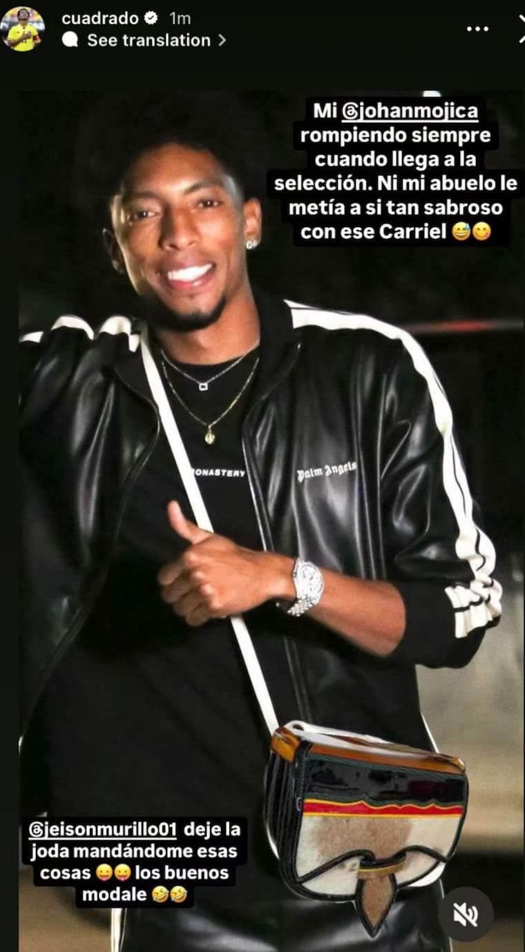 Cuadrado bromeó sobre el bolso que lucía Mojica en su llegada a Argentina. En la foto original el accesorio era de color blanco, pero la imagen que publicó Juan Guillermo en sus ‘historias’ de Instagram estaba editada y se veía, en cambio, un carriel antioqueño.