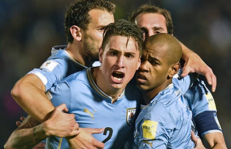 Uruguay: Fernando Muslera; José María Giménez, Diego Godín, Martín Cáceres; Maximiliano Pereira Mathias Corujo, Carlos Sánchez, Álvaro González, Álvaro Pereira; Diego Rolan, Stuani.