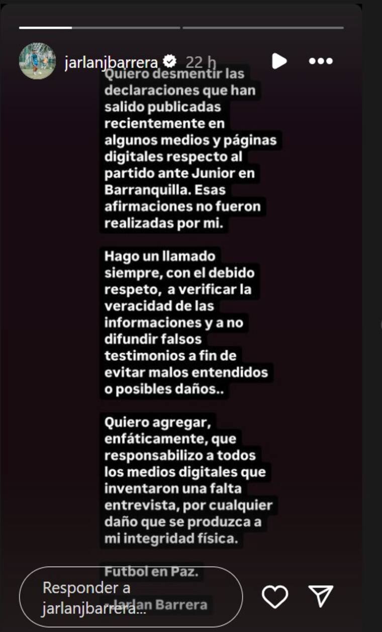 Pero él mismo señaló mediante su cuenta de Instagram que nunca había dicho eso: “Quiero desmentir las declaraciones que han salido publicadas recientemente en algunos medios y páginas digitales respecto al partido con Junior en Barranquilla. Esas afirmaciones no fueron realizadas por mí”.