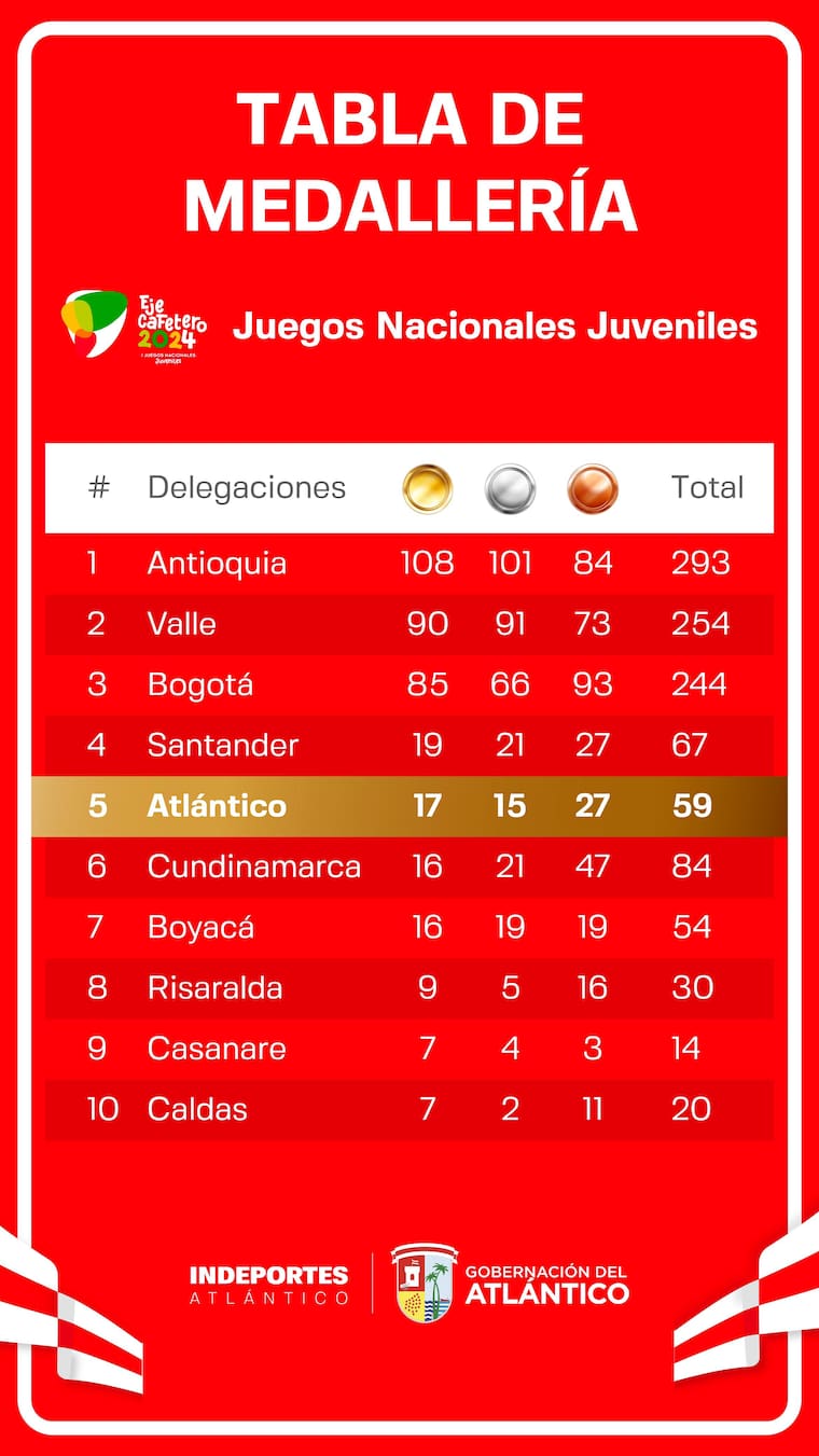 Atlántico cerró con broche de oro su participación en los I Juegos Nacionales Juveniles 2024, logrando un hito histórico al posicionarse en el quinto lugar del medallero general, lo que la convierte en la mejor delegación del Caribe colombiano en este evento inaugural. Con un total de 59 medallas obtenidas (17 de oro, 15 de plata y 27 de bronce), el departamento consolidó su presencia en el deporte nacional, destacándose por su talento y esfuerzo en cada disciplina.