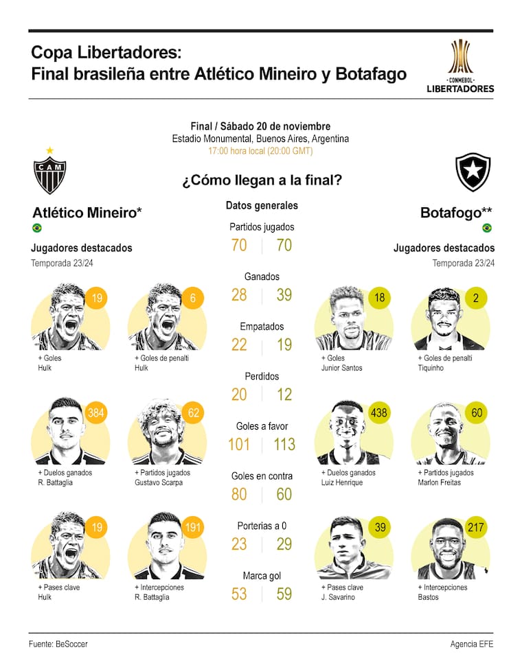 Atlético Mineiro y Botafogo se juegan este sábado el título de la Copa Libertadores 2024 en el imponente Monumental de Buenos Aires, en una final que se espera tensa tras el último encontronazo entre estos dos grandes equipos brasileños.