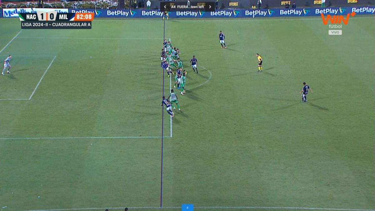 Nicolás Gallo: Bueno, voy a identificar primero cuál es el que está adelantado, porque tengo muchas piernas acá… Esta pierna no alcanzo a verla… Está muy difícil, voy a trazar una línea porque hay muchos pies. Para mí, es el pie de Tesillo. Listo, voy a hacer triangulación con el pie de Tesillo, que es el que veo acá… Virtualmente tengo el pie… Acá se ve la bota en el medio de Aguirre, ahí está… Ahora voy a trazar la línea con el delantero, que lo veo. Es el hombro.
