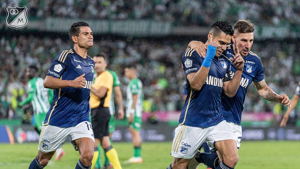 Un gol de penalti de Radamel Falcao García le dio este lunes a Millonarios un empate a domicilio 1-1 con Atlético Nacional que reafirma al club bogotano con 10 puntos en el liderato del Grupo A de los cuadrangulares semifinales de la Liga colombiana.