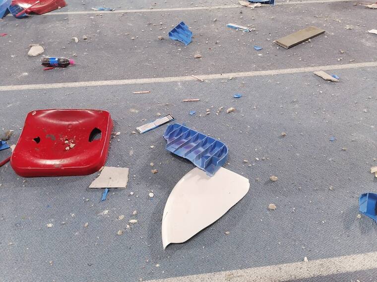 La escena del estadio es apenas desastrosa: cientos de butacas reducidas a pedazos, luego de ser arrancadas para ser utilizadas como objetos contundentes; tapas de inodoros tiradas en la pista de atletismo, al igual que las vallas de seguridad que fueron dispuestas por los organizadores en la parte baja de las tribunas.