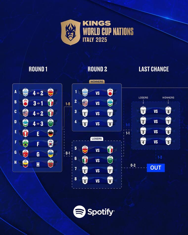 La Kings World Cup Nations es un evento de fútbol que se juega en el formato suizo en el que cada enfrentamiento será decisivo para avanzar en cada una de las cinco rondas con las que cuenta: en la primera serán ocho partidos, los que ganen pasan al round 2 y se enfrentarán en cuatro partidos entre ganadores. Aquí aún permanecen las 16 selecciones independientemente de si ganaron o perdieron.