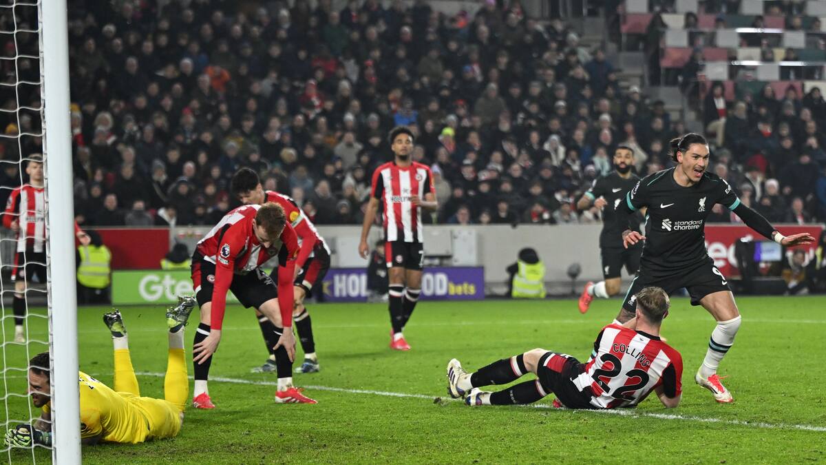 Harvey Elliott condujo hasta la frontal, cedió la pelota a Darwin y este se libró del acoso de los defensas con un toque hacia su pierna derecha con la que fusiló a Flekken, meta del Brentford.