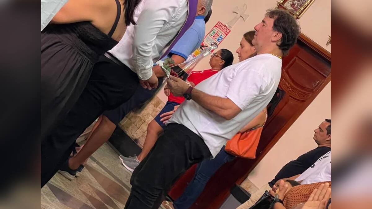 La fotografía fue compartida por el exjugador de Junior Martín Arzuaga en sus redes sociales, en la que se ve al entrenador rodeado de otros feligreses, mientras sostiene una bandeja con lo que parece ser vino de consagrar.
