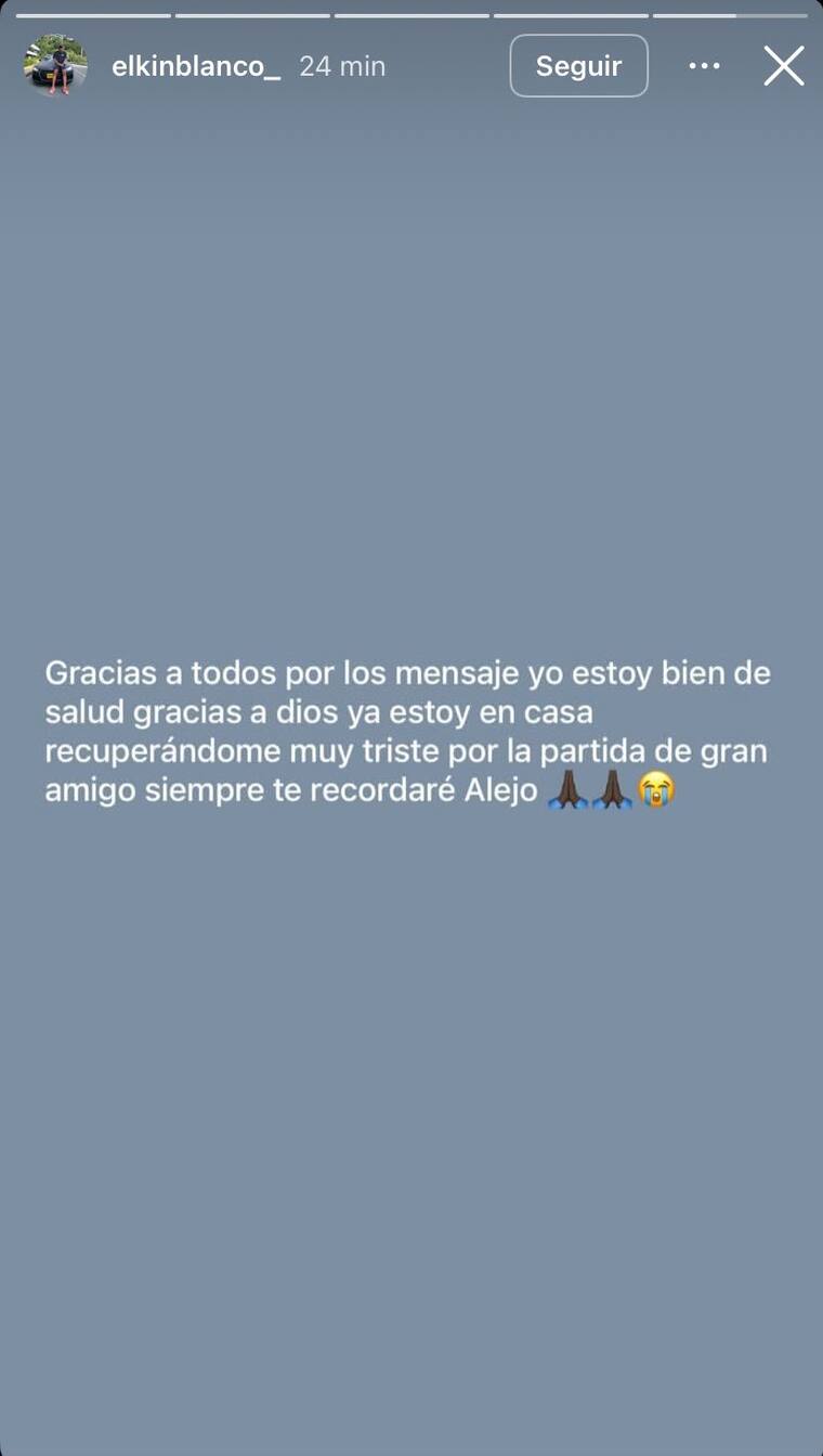 “Gracias a todos por lo mensajes, yo estoy bien de salud, gracias a Dios ya estoy en casa recuperándome, muy triste por la partida del gran amigo, siempre te recordaré Alejo”, escribió Elkin en sus ‘historias’ de Instagram en la mañana de este domingo.