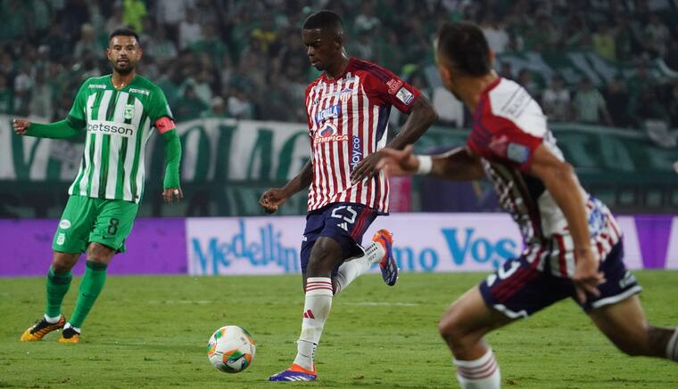 Andrés Colorado manejando el balón ante el desmarque de ‘Tití’ Rodríguez y la mirada de Edwin Cardona, en el partido entre Junior y Nacional.