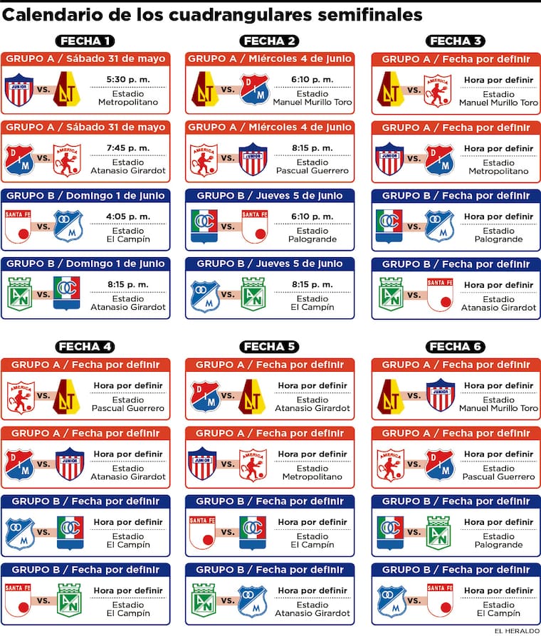 Mientras que la segunda jornada de esa zona quedó programada así: Tolima vs. Medellín (miércoles 4 de junio, 6:10 p.m.), América vs. Junior (miércoles 4 de junio, 8:15 p.m.).