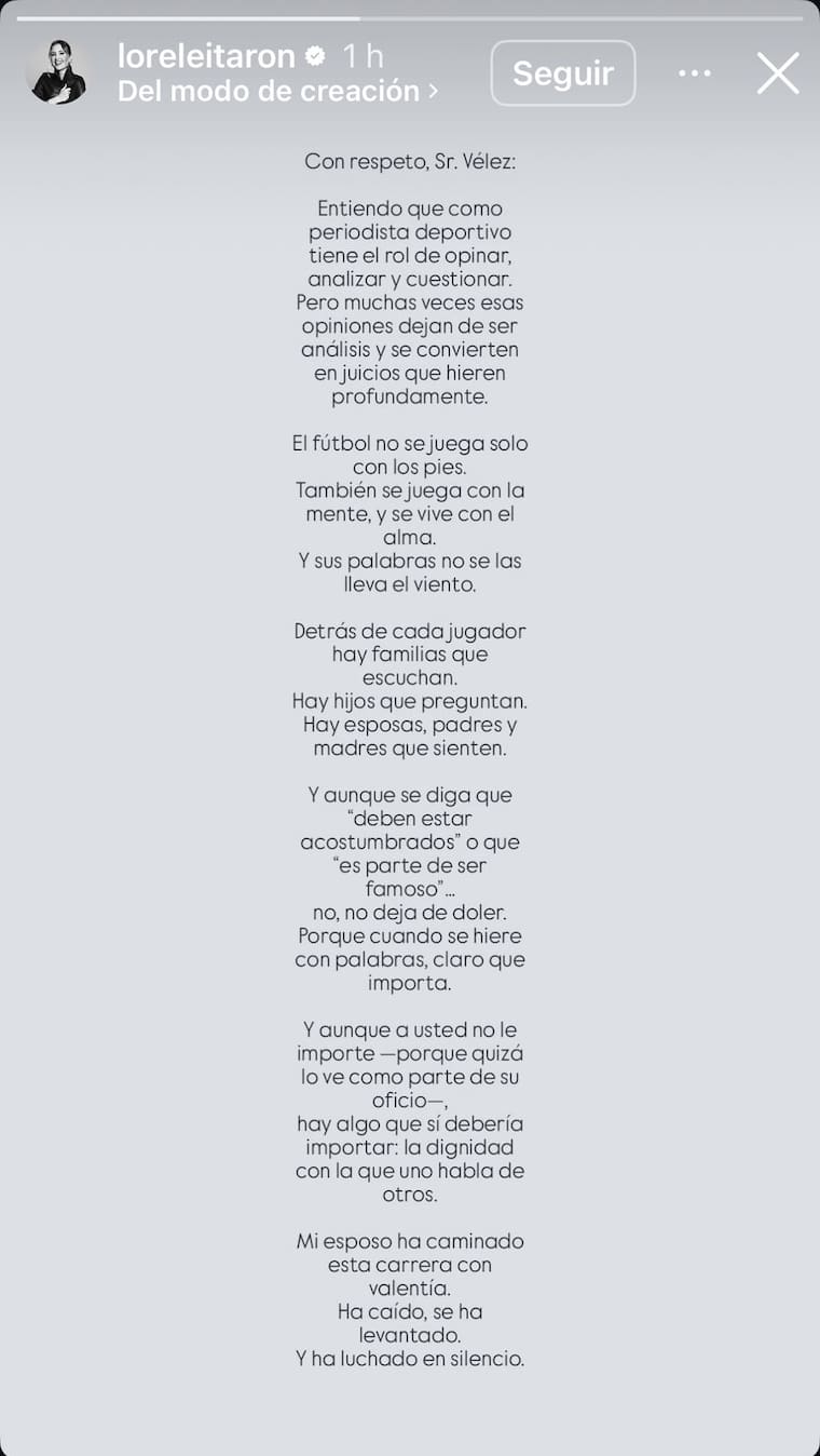 “Con respeto, Sr. Vélez: entiendo que como periodista deportivo tiene el rol de opinar, analizar y cuestionar. Pero muchas veces esas opiniones dejan de ser análisis y se convierten en juicios que hieren profundamente. El fútbol no se juega solo con los pies. También se juega con la mente, y se vive con el alma. Y sus palabras no se las lleva el viento. Detrás de cada jugador hay familias que escuchan. Hay hijos que preguntan. Hay esposas, padres y madres que sienten. Y aunque se diga que “deben estar acostumbrados” o que “es parte de ser famoso” no, no deja de doler. Porque cuando se hiere con palabras, claro que importa”, se desahogó Tarón.