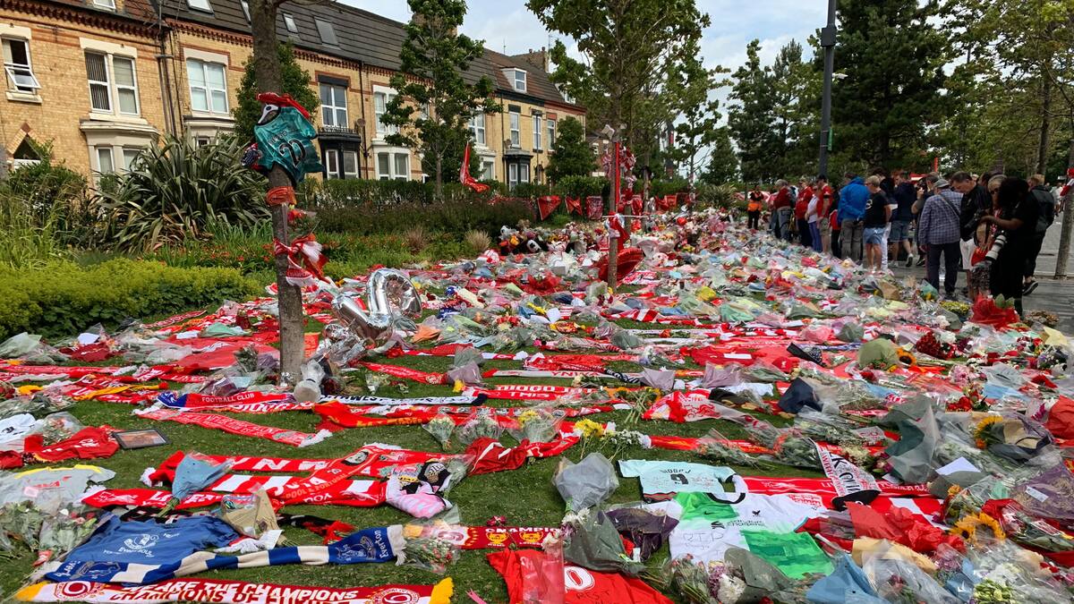 La iniciativa, que nació en las redes sociales, se extendió con rapidez a los cientos de seguidores del conjunto ‘Red’ que se congregaron frente a la fachada de la grada principal del estadio de Anfield, donde emergió un improvisado mar de banderas, bufandas y flores en memoria del portugués.