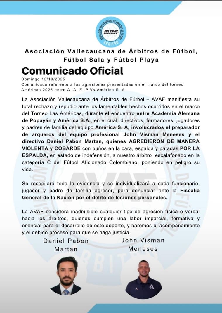 “La Asociación Vallecaucana de Árbitros de Fútbol (Avaf) manifiesta su total rechazo y repudio ante los lamentables hechos ocurridos en el marco del Torneo Las Américas, durante el encuentro entre Academia Alemana de Popayán y América S.A., en el cual, directivos, formadores, jugadores y padres de familia del equipo América S. A, involucrados el preparador de arqueros del equipo profesional John Visman Meneses y el directivo Daniel Pabón Martan, quienes agredieron de forma violenta y cobarde con puños en la cara, espalda y patadas por la espalda, en estado de indefensión, a nuestro árbitro escalafonado en la categoría C del Fútbol Aficionado Colombiano, poniendo en peligro su vida”, escribieron.