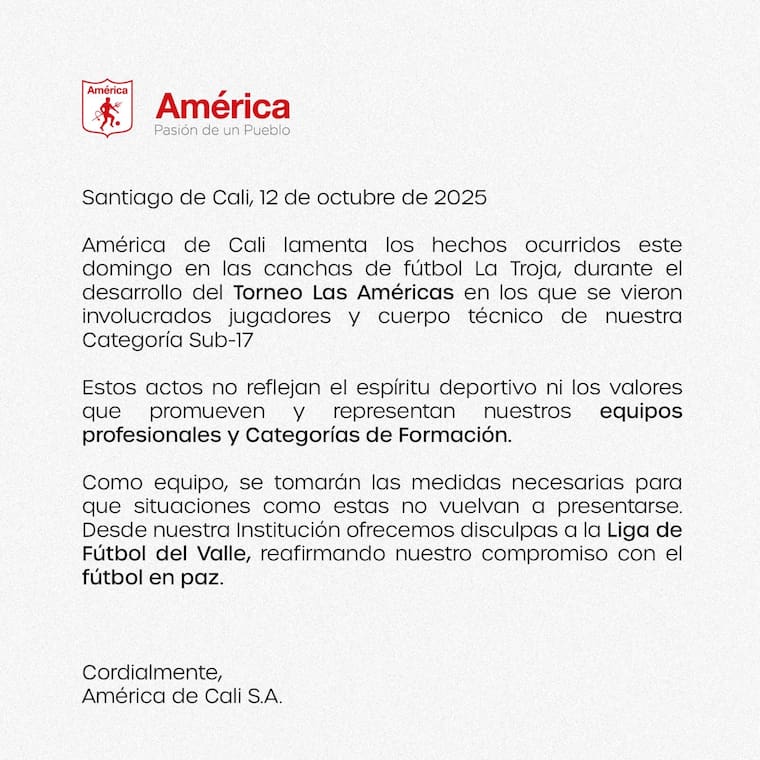 Horas después, el América de Cali emitió su propio pronunciamiento lamentando lo sucedido en las canchas de La Troja.