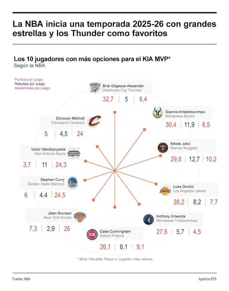 Cuatro meses después, la NBA echa a andar este martes con una nueva temporada repleta de estrellas hambrientas de gloria, encabezadas por Luka Doncic y sus Lakers, pero también los Denver Nuggets del serbio Nikola Jokic, los Golden State Warriors de Steph Curry y Jimmy Butler, o los nuevos Houston Rockets de Kevin Durant.