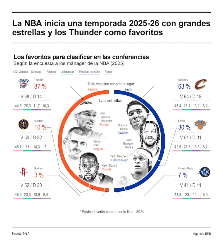 En el Este, con la gran incógnita de unos Boston Celtics que no podrán contar con Jayson Tatum, baja todo el año por la grave lesión en el tendón de Aquiles sufrida en los últimos ‘playoffs’, y que dejaron salir a Jrue Holiday y a Kristaps Porzingis, equipos como los New York Knicks del dominicano Karl Anthony Towns y Jalen Brunson o los Milwaukee Bucks de Giannis Antetokounmpo ven oportunidades para llegar hasta el final.