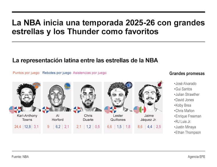 Entre los latinos a seguir, destacan el dominicano Karl Anthony Towns en New York, el dominicano Al Horford, que cambió a los Boston Celtics por los Warriors, y el mexicano Jaime Jáquez Jr. en su tercera temporada en los Miami Heat.