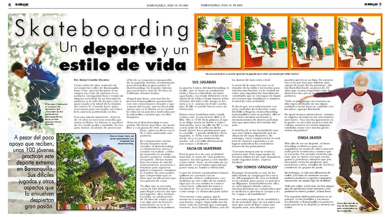 “Qué bueno que al skate no lo vean ya como una cuestión de chicos rebeldes, que sea respetado como un deporte más. Es un orgullo ver que en Barranquilla la administración Distrital le apuesta a eso, uno se siente orgulloso. No me tocó a mí, pero sí a la generación que viene y me siento muy satisfecho”, dijo Hans Burchardt, quien asistió el lunes 3 de noviembre a la inauguración del nuevo skatepark de la ciudad, diseñado por uno de sus camaradas de aquellas viejas épocas, Daniel Lizcano, arquitecto de la Universidad del Atlántico.
