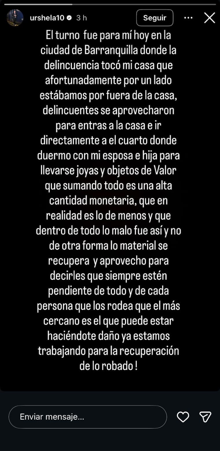 “El turno fue para mí hoy en la ciudad de Barranquilla, donde la delincuencia tocó mi casa”, inicia el mensaje que publicó en sus ‘historias’.