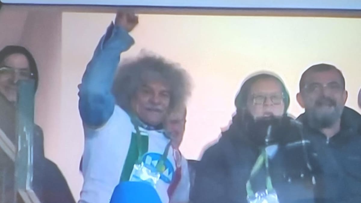 Valderrama, que alcanzó a ser reconocido por varios de los seguidores del Amed SFK, se acomodó en un palco del escenario y desde ahí saludó y posó para las fotos que le pedían los aficionados.