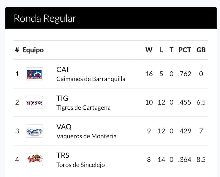 Los saurios ahora son primeros a 6.5 juegos de sus escoltas, los Tigres de Cartagena. En el tercer puesto están los Vaqueros de Montería a 7.0 y cierra el standing los Toros a 8.5 del puntero.