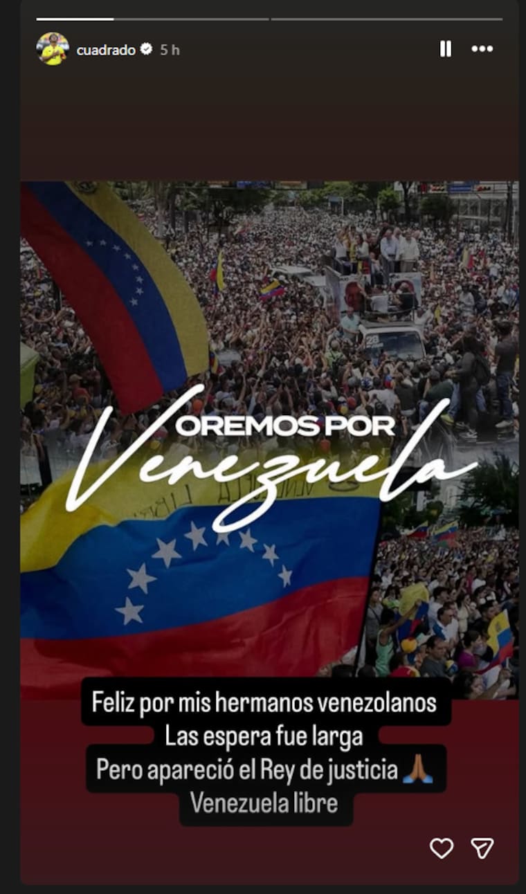 “Feliz por mis hermanos venezolanos. La espera fue larga, pero apareció el Rey de justicia. Venezuela libre”, escribió Cuadrado, un mensaje que rápidamente generó reacciones encontradas en plataformas digitales, entre muestras de apoyo y llamados a la cautela.