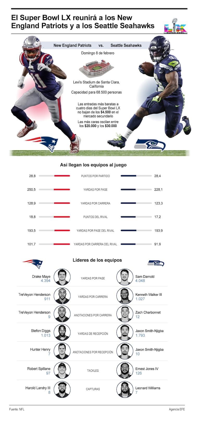 Por primera vez en cuatro años Patrick Mahomes y los Kansas City Chiefs no forman parte de la gran final de la NFL, pero Seahawks y Patriots se ganaron el derecho a jugarse el trofeo Vince Lombardi en Santa Clara con unas defensas feroces y dos quarterback, Sam Darnold y Drake Maye, decididos a hacerse un hueco en el Olimpo del fútbol americano.
