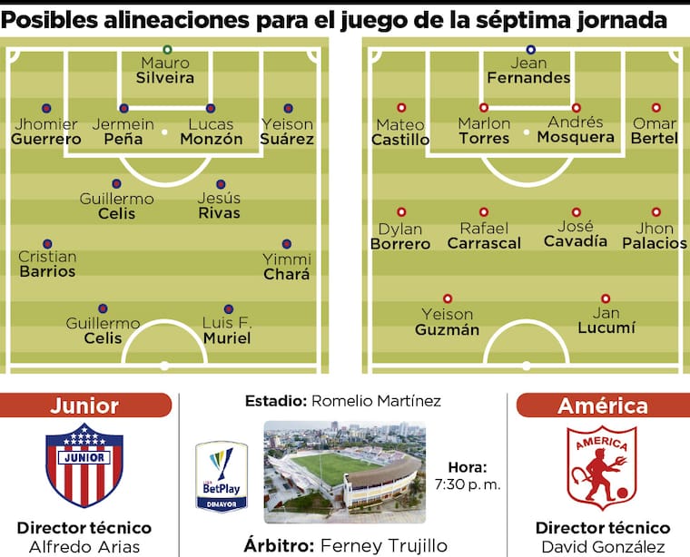 Al medio volverá Guillermo Celis —baja sensible en la derrota ante Once Caldas—, quien estará acompañado por Jesús Rivas. Yimmi Chará y Cristian Barrios, ex América de Cali, jugarán un poco más abiertos, mientras que en punta estarían el paraguayo Guillermo Paiva con el atlanticense Luis Fernando Muriel, repitiendo ese doble ‘9’ que se vio en el triunfo (3-0) ante el Chicó FC, en el primer partido de Junior este semestre en el estadio Romelio Martínez.