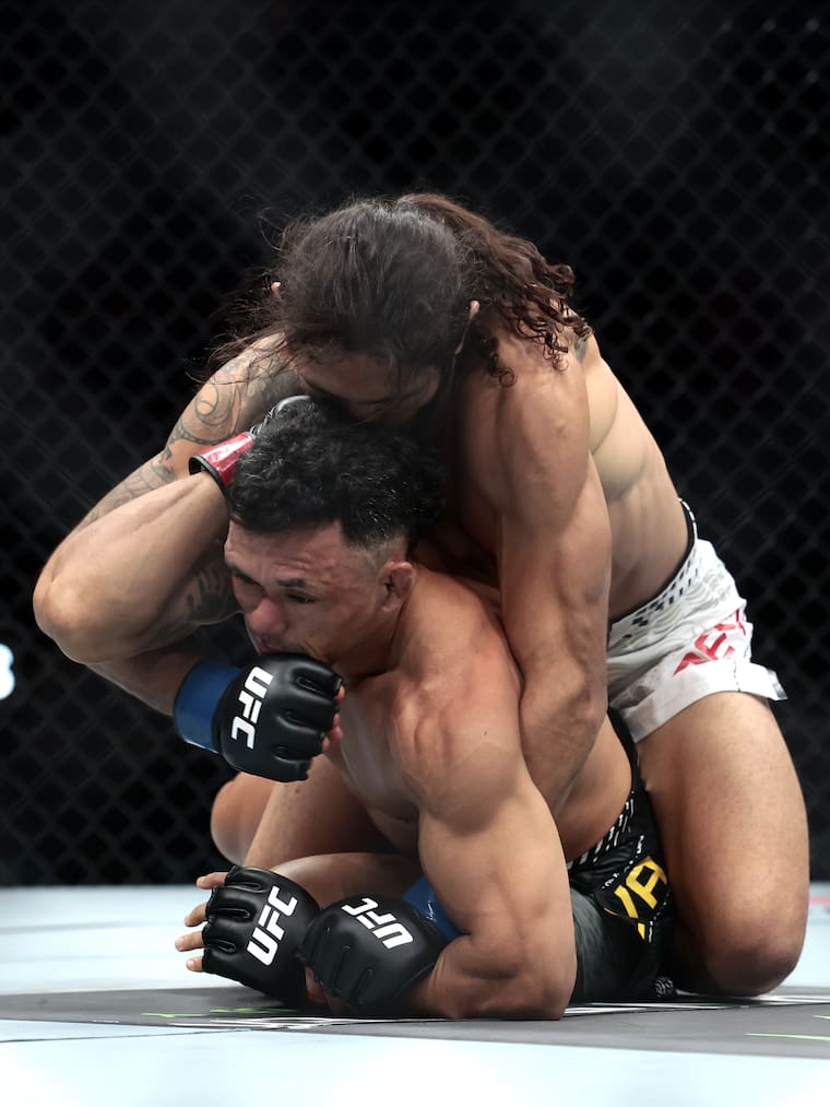 Douglas Silva escapó, pero ‘Blair’ volvió a conectarlo de forma contundente con la derecha; lo derribó y le aplicó una montada por la espalda seguida de una tormenta de puñetazos que Silva intentó defender con sus manos colocadas a los costados del rostro.
