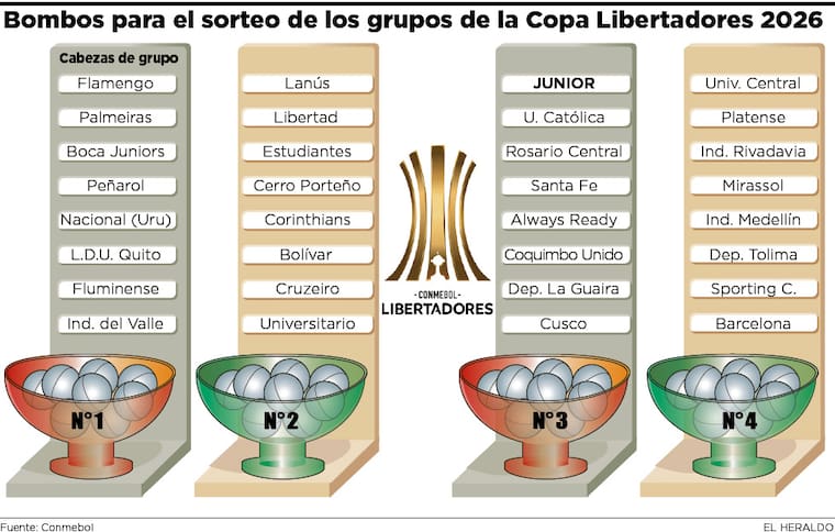 El sorteo se realizará de manera progresiva: primero se ubicarán los cabezas de serie, luego los equipos del bolillero 2, posteriormente los del 3 —donde aparece Junior— y finalmente los del 4.