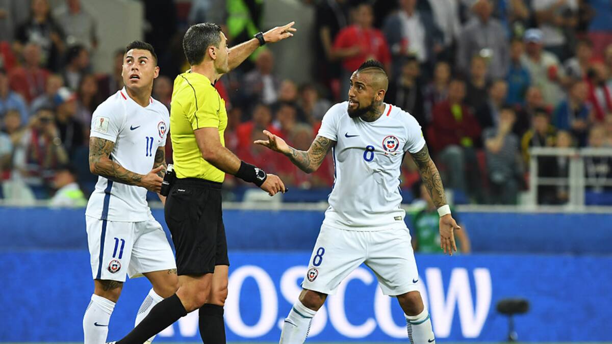 La prueba. Los jugadores chilenos simulaban una partida a un videojuego sentados en el césped para celebrar el gol de Eduardo Vargas cuando el árbitro Damir Skomina interrumpió la fiesta para que se revisara la acción en el VAR (video de asistencia al árbitro). Lo anuló por fuera de juego y se desencadenó la tormenta.