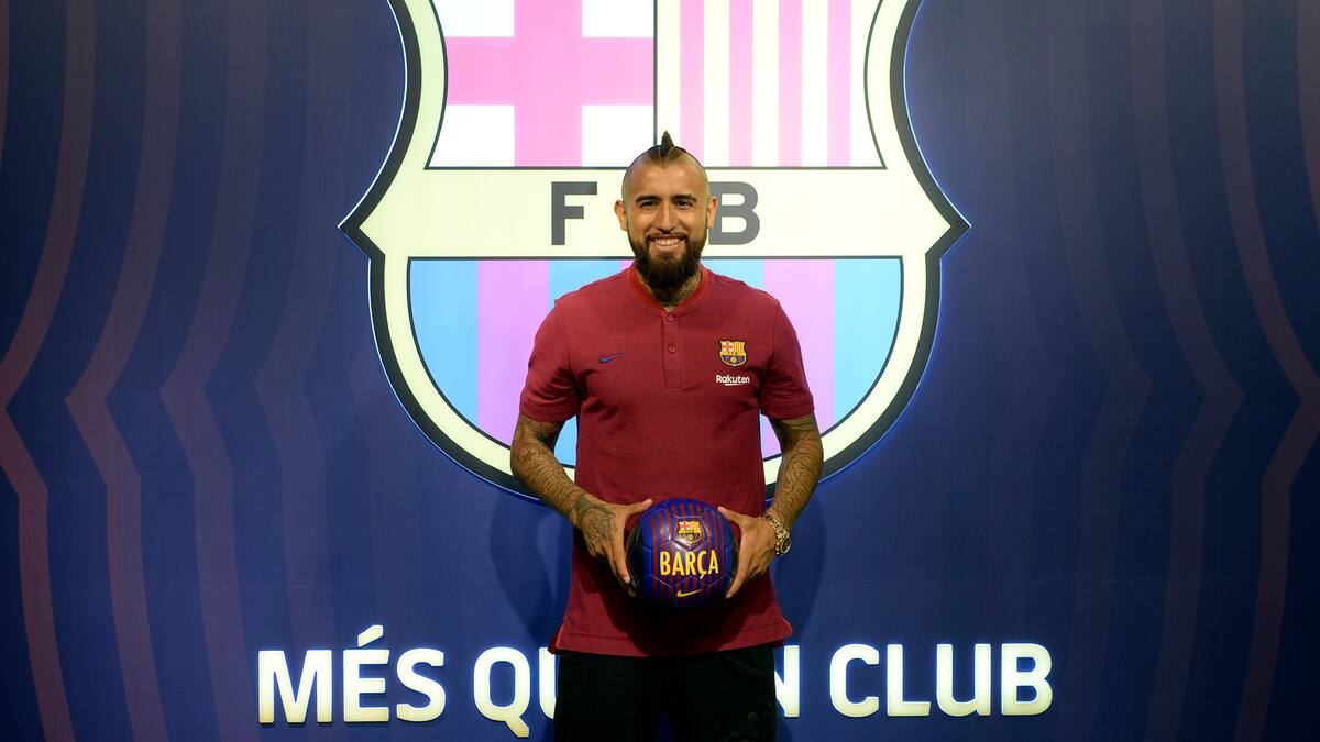 Arturo Vidal ya porta el escudo del Barcelona. El volante chileno fue presentado esta tarde por el club catalán, en el que espera jugar, por lo menos tres años, según el contrato.
