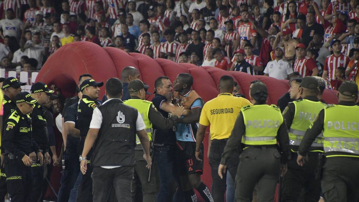 Lo que comenzó dentro del campo con una fuerte discusión terminó afuera con una bochornosa pelea. Los jugadores del América de Cali se enfrentaron contra la Policía en el estadio Metropolitano luego de la derrota que sufrieron 4-3 ante Junior en Barranquilla, dejando así una imagen bastante penosa.
