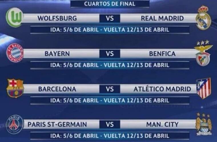Real Madrid y Bayern Múnich fueron los más afortunados del sorteo de los cuartos de final de la Liga de Campeones al quedar emparejados con el Wolfsburgo y el Benfica, respectivamente, un regalo que no tendrán el Barcelona y el Atlético o el Manchester City y el PSG, protagonistas de dos duelos fratricidas en esta ronda de la competencia europea.