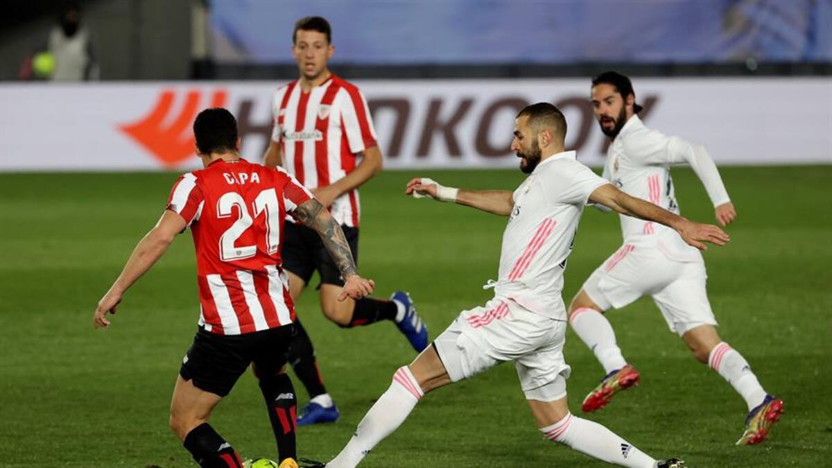 En el minuto 74 y tras un gol anulado a Vinicius, un testarazo de Benzema adelantó al equipo de Zidane que vio como Courtois salvaba el triunfo con una gran parada a Vesga antes del doblete del delantero francés.