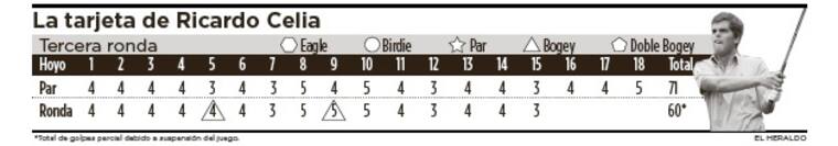 El golfista barranquillero Ricardo ‘Pipo’ Celia no estuvo tan fino como en sus dos primeras rondas y presentaba ayer, antes de que se suspendiera la jornada por falta de luz, una tarjeta de 60 golpes hasta el hoyo 15 (dos bogeys en el hoyo 5 y 9).