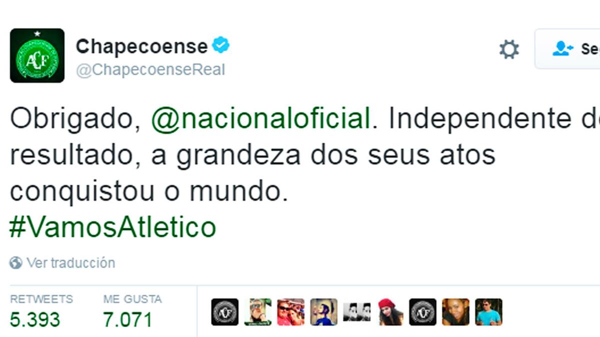 'Gracias, Nacional. Independientemente del resultado, la grandeza de tus actos conquistó el mundo', reza un mensaje en la cuenta oficial de twitter del Chapecoense.