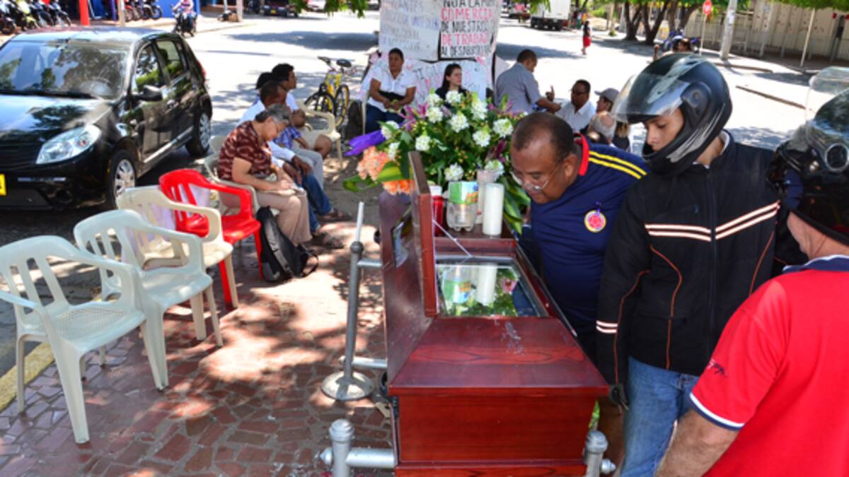 Con un ataúd, cintas de color morado y arreglos florales, los comerciantes de la avenida Simón Bolívar en Valledupar manifestaron su desacuerdo con las obras de rehabilitación de esta vía por parte de la Gobernación del Cesar.