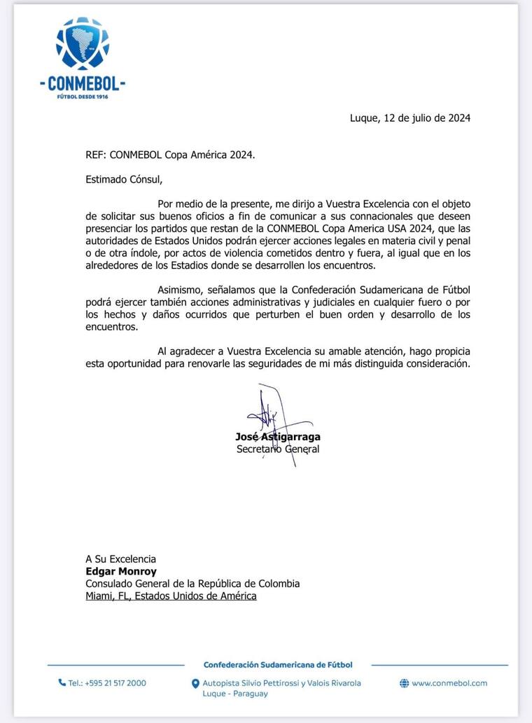 En la carta dirigida al cónsul colombiano, Astigarraga subraya la posibilidad de que las autoridades estadounidenses puedan tomar “acciones legales en materia civil y penal o de otra índole” contra aquellos involucrados en actos de violencia dentro o fuera de los estadios durante lo que resta de la Copa América.