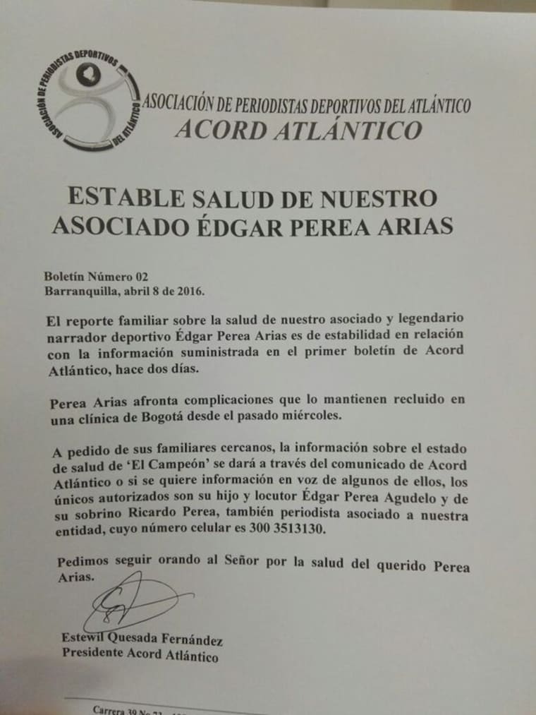 'El reporte familiar sobre la salud de nuestro asociado y legendario narrador deportivo Édgar Perea Arias es de estabilidad', así lo aseguró esta tarde la Asociación Colombiana de Periodistas Deportivos del Atlántico (Acord) a través de un comunicado oficial.