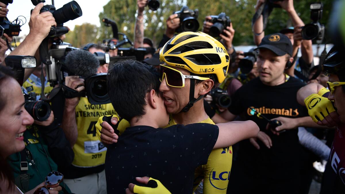 El ciclista colombiano le dio un beso en la frente a su hermano y luego abrazó a su madre tras finalizar la última etapa del Tour de Francia y ser el primer escarabajo ‘Tricolor’ en ganar en toda la historia esta competición.