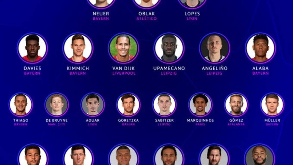 Jan Oblak (Atlético de Madrid) y Anthony Lopes (Olympique Lyon) completan la nómina de tres porteros y Virgil Van Dijk (Liverpool) y Upamecano y Angeliño (Leipzig) también están entre los defensas, mientras Kevin De Bruyne (Manchester City), Houssem Aouar (Olympique Lyon), Marcel Sabitzer (Leipzig), Marquinhos (París Saint Germain) y Papu Gómez (Atalanta) forman como centrocampistas.